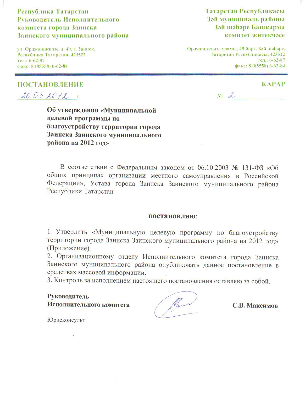от 20.03.2012 г. № 2 «Об утверждении «Муниципальной целевой программы по благоустройству территории города Заинска Заинского муниципального района на 2012 год»