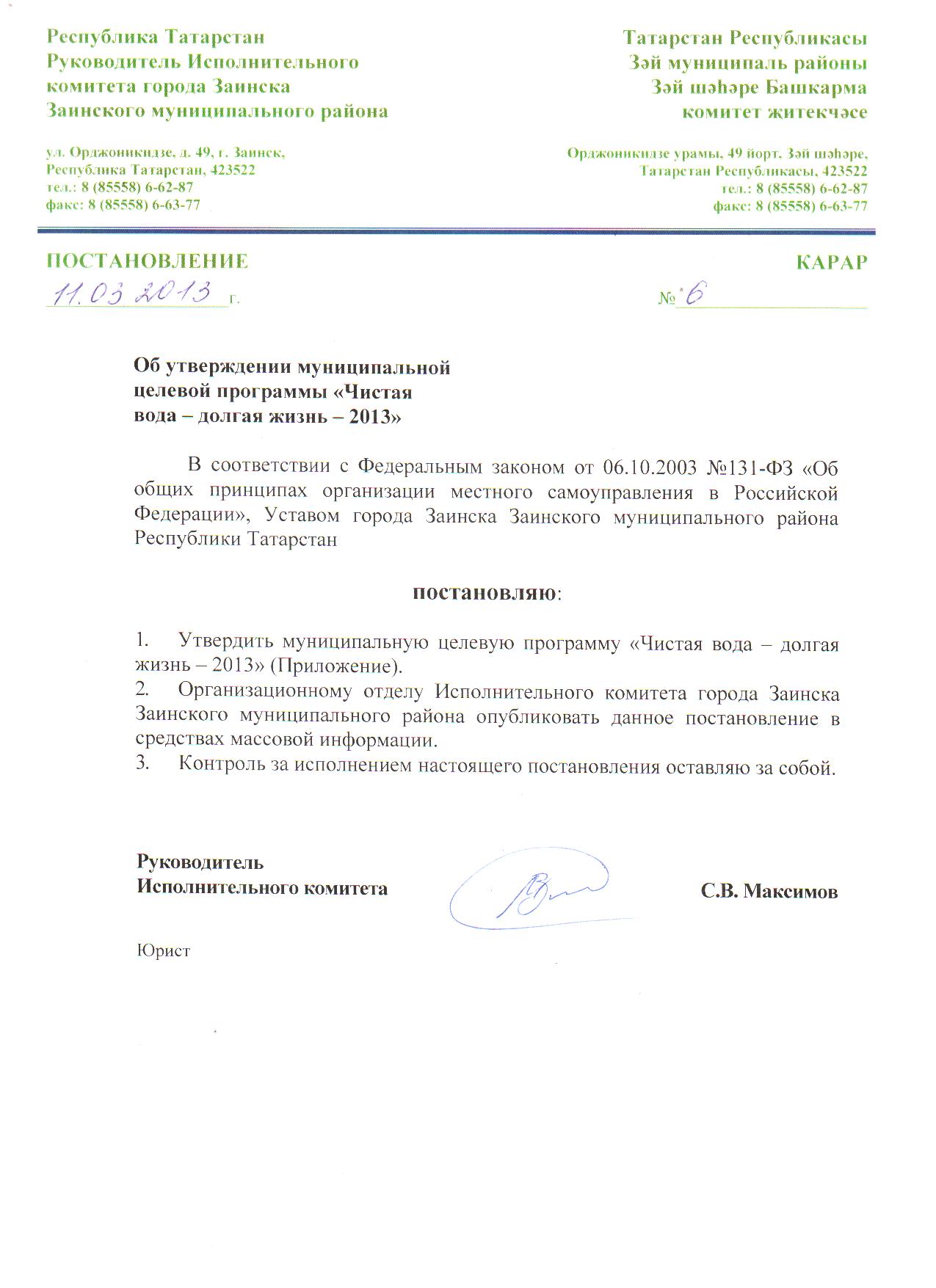 от 11.03.2013 г. № 6 «Об утверждении муниципальной целевой программы «Чистая вода – долгая жизнь – 2013»»