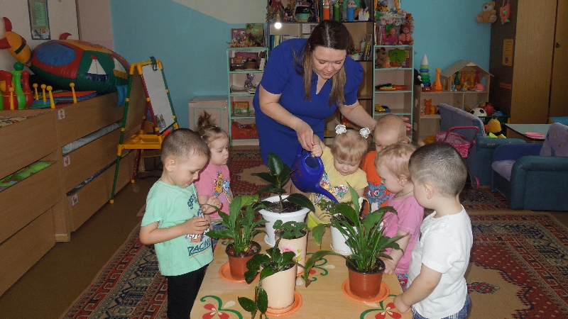 Любовь к природе, к растительному миру в детском саду «Солнышко» воспитывают у детей с малых лет. В ясельной группе воспитатель Ахмадиева Г.И. ознакомила малышей с комнатными цветами, рассказала и показала, как правильно за ними ухаживать и поливать. Дети с интересом наблюдали за работой воспитателя, с удовольствием ей помогали.