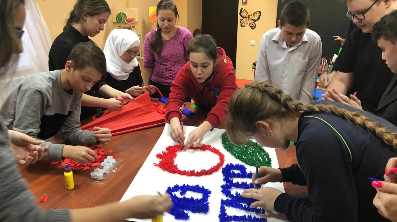 Сотрудники Управления по делам молодежи пригласили Верхнешипкинскую сельскую молодёжь в молодёжный центр «Дуслык» с дружественным визитом. Для подростков был подготовлен мастер-класс по созданию коллективной композиции, приуроченный к празднованию 100-летия образования ТАССР. Крепированная бумага стала оригинальной альтернативой краскам. Буквы и элементы плаката получились объемными и красочными.