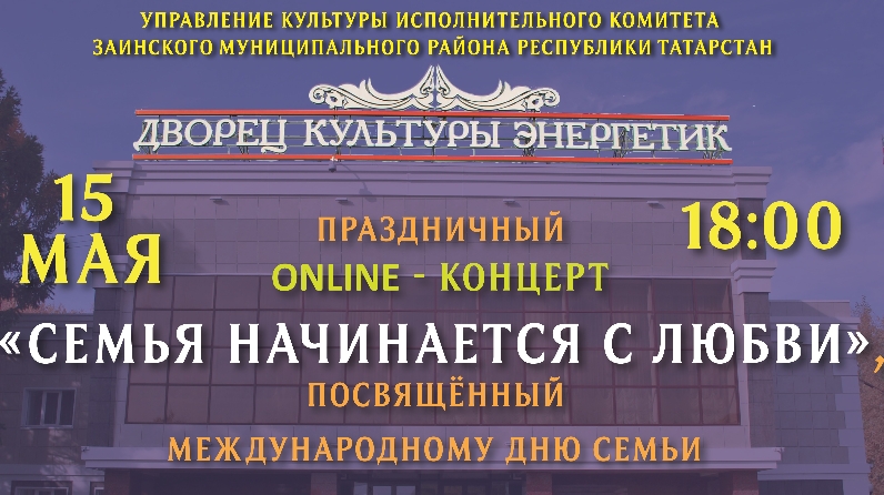 15 мая - Международный День семьи. Данный праздник был учрежден Генеральной Ассамблеей ООН. Уважаемые жители и гости города сегодня в 18.00 состоится праздничный концерт «Семья начинается с любви» в прямом эфире в инстаграм @kultura_zainsk. Музыкальную программу представит концертная группа «Горячие сердца» Дворца культуры «Энергетик». Праздничные эмоции и хорошее настроение гарантируем.