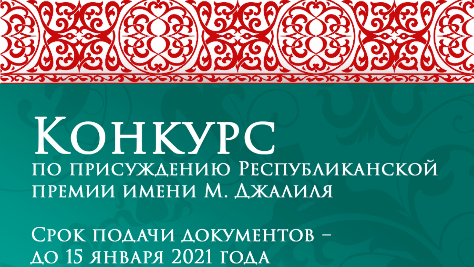 Министерством по делам молодежи Республики Татарстан объявлен старт приема заявок на конкурс по присуждению Республиканской премии им.М.Джалиля 2020 – 2021 годов. Данная премия присуждается один раз в два года четырем лауреатам – талантливым представителям молодежи Республики Татарстан в возрасте до 30 лет, а также отдельным авторам старше 30 лет, коллективам, творческим объединениям, работающим для молодежи (с молодежью), за вклад в развитие искусства, науки, образования, воспитания, за высокие достижения в области молодежного предпринимательства, реализацию молодежных программ. Заявки на участие в конкурсе принимаются в срок до 15 января 2021 года по адресу: 420021, г. Казань, ул. Г. Тукая, д.58, офис 302 (Государственное бюджетное учреждение «Молодежный центр Республики Татарстан»). В феврале состоится подведение итогов очередного конкурса на присуждение Республиканской премии им. М. Джалиля.