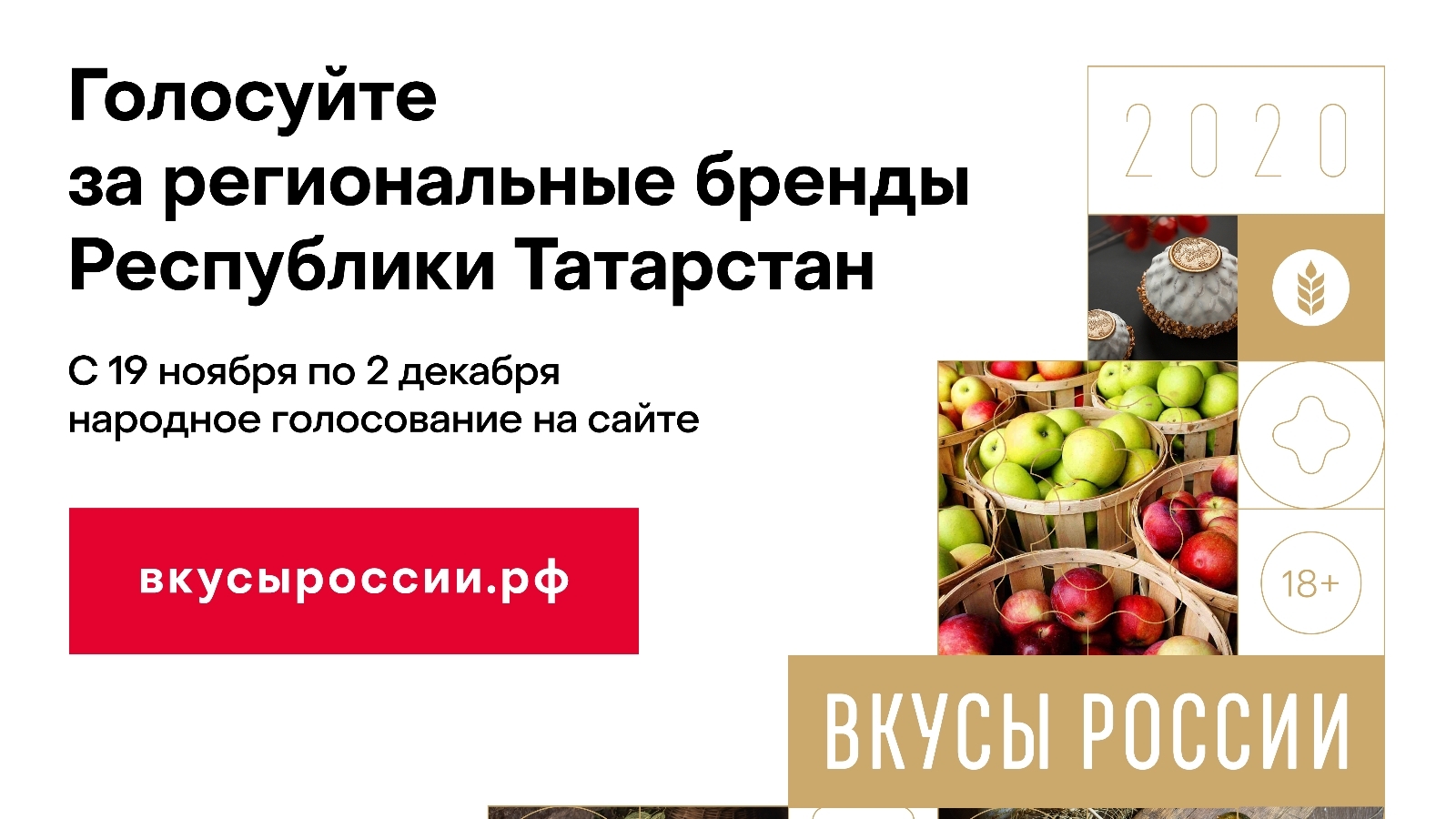 Минсельхозпрод РТ информирует, что с 19 ноября по 2 декабря на портале первого национального конкурса региональных брендов «Вкусы России» стартует народное голосование. Это первый этап комплекса мероприятий по поддержке такой продукции, который Минсельхоз России реализует по поручению Президента Российской Федерации.