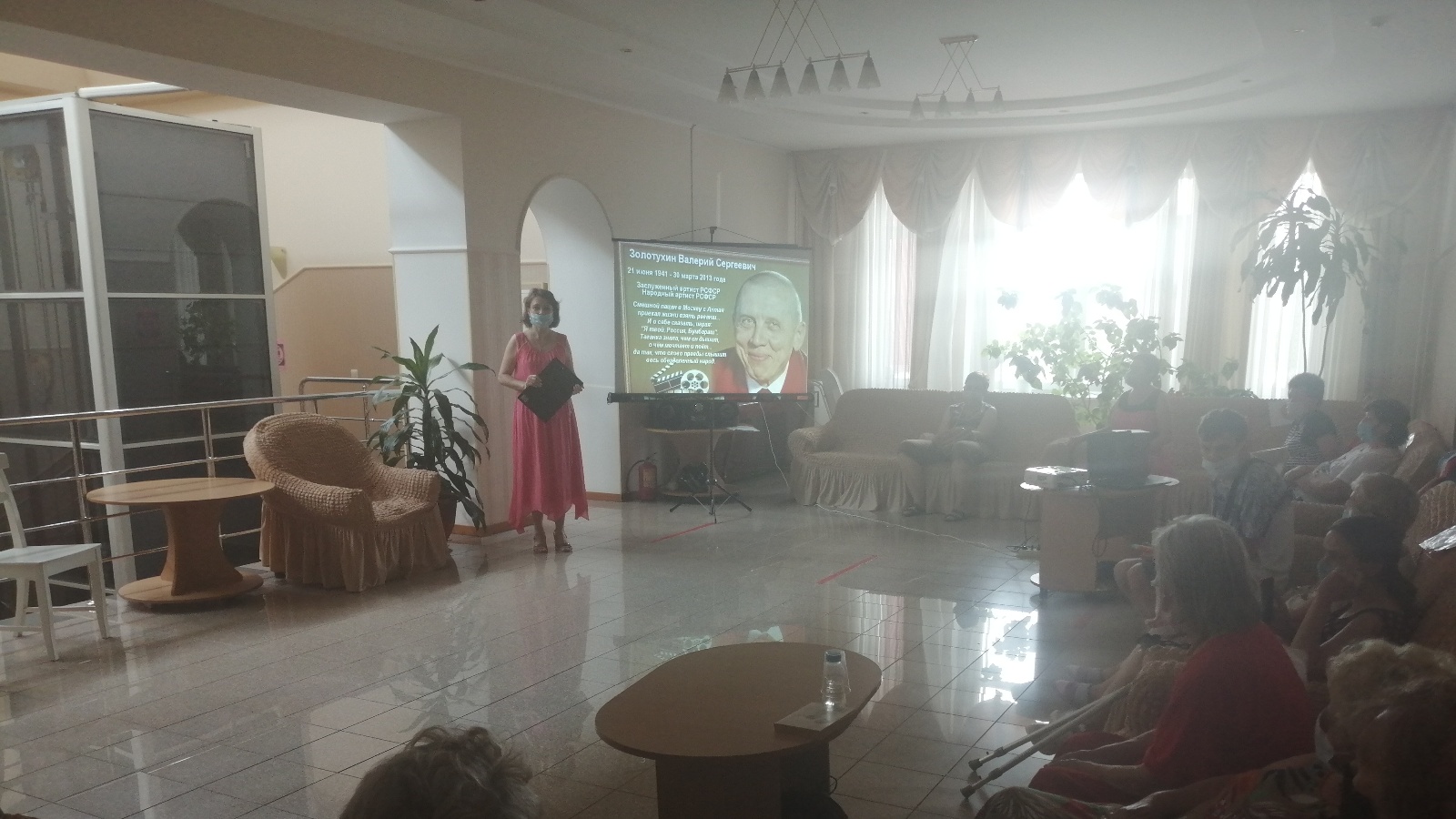 23 июня для отдыхающих АНО «Центр социальной помощи «Шатлык» («Радость») прошел литературно-музыкальный час «Истинно народный характер», посвященный 80-летию со дня рождения российского актера театра и кино Валерия Сергеевича Золотухина. Ведущая мероприятия познакомила гостей с жизненным и творческим путем народного артиста России, любимца миллионов зрителей, легенды театра на Таганке, с биографией деревенского мальчика, который верил в свою мечту и смог ее осуществить. Узнали о Золотухине как об актере, в послужном списке которого более 70 всем известных фильмов: «Бумбараш», «Хозяин тайги», «Интервенция», «Единственная» и многие другие. Участники встречи смогли погрузиться во времена своей молодости, с удовольствием смотрели отрывки из кинофильмов с участием любимого актера, послушали песни в его исполнении. К мероприятию была оформлена красочная выставка «Валерий Золотухин. Я никогда ничего не просил…», на которой представлены произведения Золотухина, книги о нём, кадры из его кинофильмов.