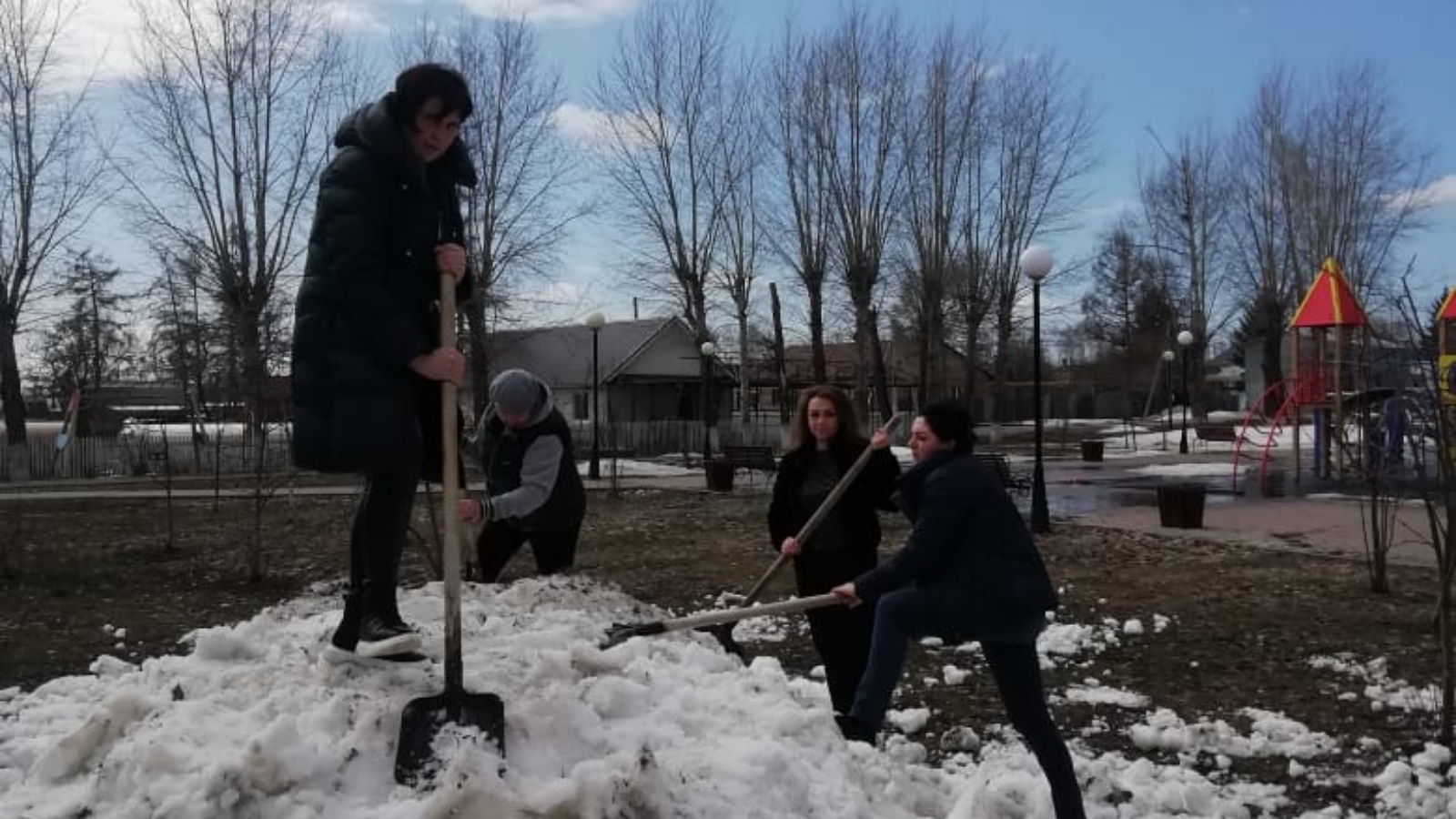 Продолжается работа по экологическому двухмесячнику. Работники МБДОУ «Детский сад «Рябинка» вышли на уборку снега в парк.