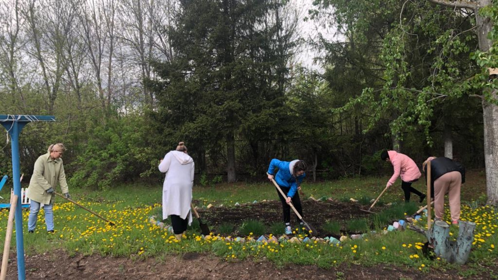 Сотрудники детского сада занимались подготовкой клумбы и посадкой цветов.