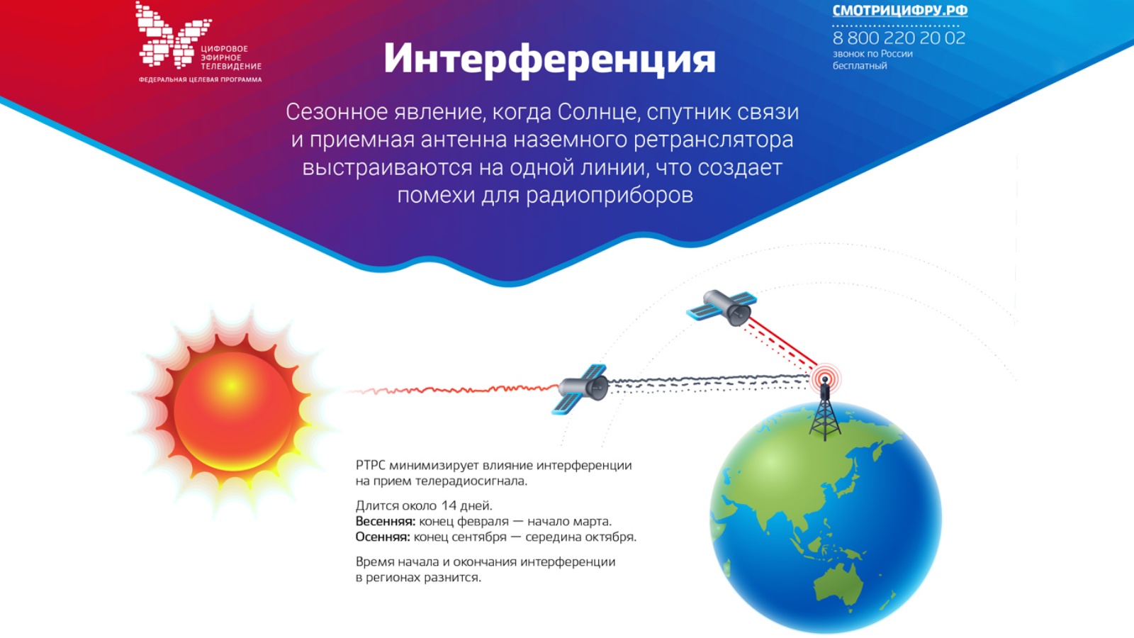Филиал Российской телевизионной и радиовещательной сети «РТПЦ Республики Татарстан», сообщает что в период с 27.09.2022г. по 20.10.2022 г. в интервале времени с 11:33 до 12:42, в связи с солнечной интерференцией (влияния Солнца на антенны спутниковых приемных земных станций) на территории Республики Татарстан, возможны кратковременные ухудшения работы сети цифрового эфирного телевизионного вещания (ЦЭТВ).