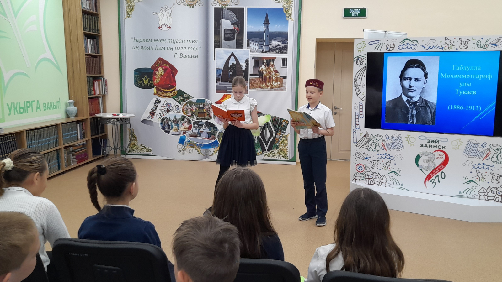 К мероприятию была подготовлена книжная выставка, на которой можно было поближе познакомиться с творчеством поэта. Также были показаны мультфильмы, снятые по мотивам его произведений «Водяная», «Коза и баран». В конце мероприятия ребята с удовольствием спели песню «Туган тел», которая стала уже гимном татарского народа.