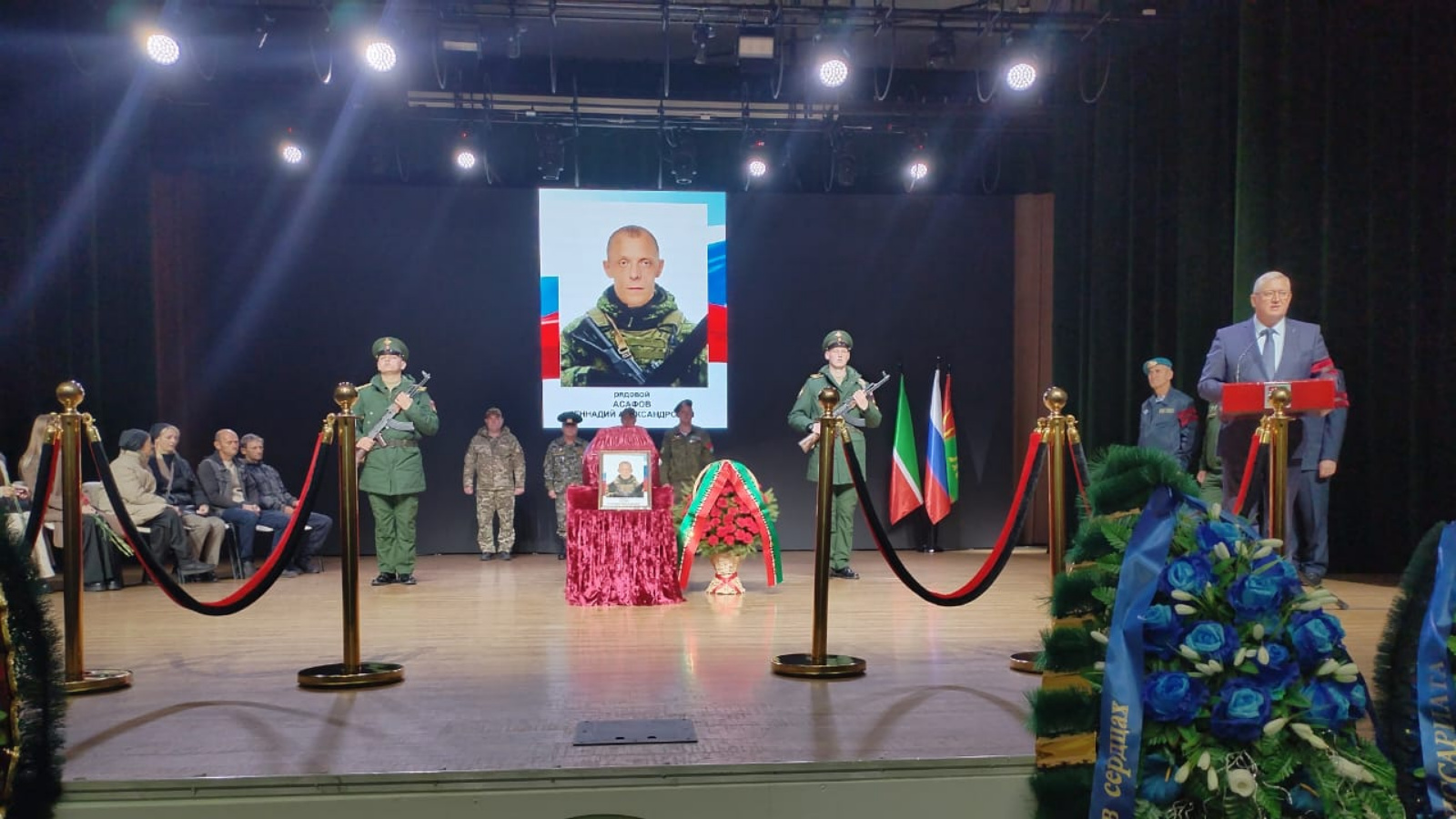 Сегодня Заинский район простился с рядовым контрактной службы, уроженцем мкр. Заинск -2 Асафовым Геннадием Александровичем, погибшим при участии в специальной военной операции. Траурная панихида прошла в ДК «Энергетик». Со словами соболезнования к матери, сестре, родным и близким Геннадия Александровича, ко всем заинцам обратился Глава района Р.Г. Каримов. «От имени Раиса Республики Татарстан, от себя лично и от всех заинцев выражаю искреннее соболезнование в связи с тяжелой утратой. Словами не передать боль от потери близкого человека. Мы все сегодня скорбим вместе с вами. Геннадий Александрович будет жить в сердцах заинцев примером истинного патриотизма и настоящего героизма. Пусть воин покоится с миром», -сказал Разиф Галиевич. Также со словами соболезнования к собравшимся от имени Министерства обороны Российской Федерации, военного комиссариата Республики Татарстан, командования войсковой части и от себя лично обратился старший специалист – эксперт военного комиссариата г. Заинск и Заинского района Георгий Борисов. Геннадия Асафова в последний путь проводили со всеми воинскими почестями. Собравшиеся минутой молчания почтили память земляка, возложили цветы. Похоронили военнослужащего на кладбище мкр. Мирный. Память о герое - участнике специальной военной операции будет жить в сердцах заинцев вечно.