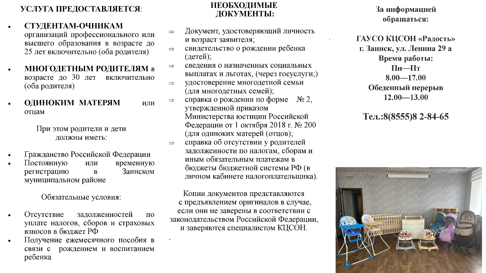 Для того чтобы оформить прокат, заявителю необходимо иметь гражданство Российской Федерации, постоянную регистрацию на территории Заинского района, получать установленное законодательством пособие на ребенка, а также не иметь задолженностей по налоговым платежам.