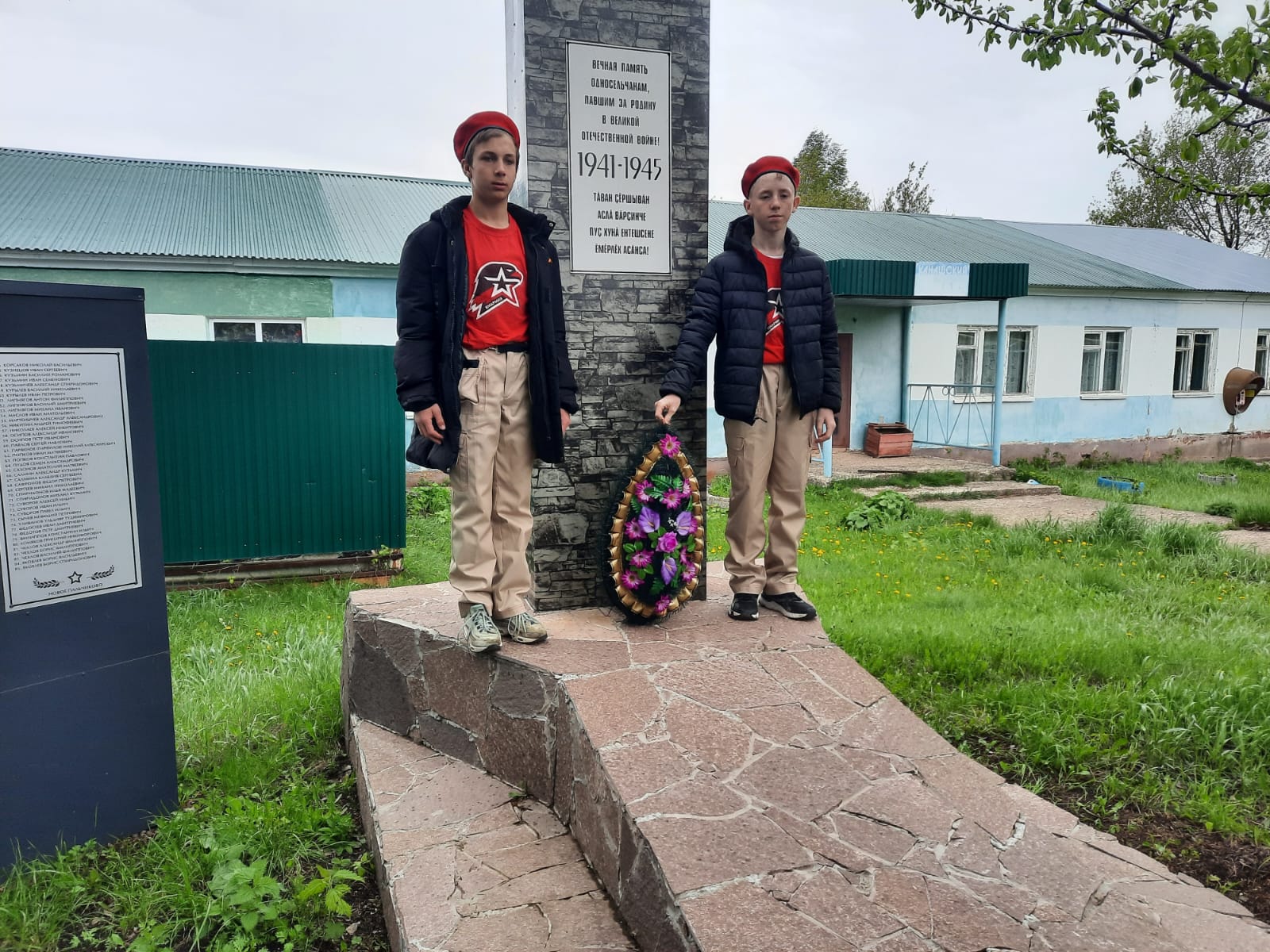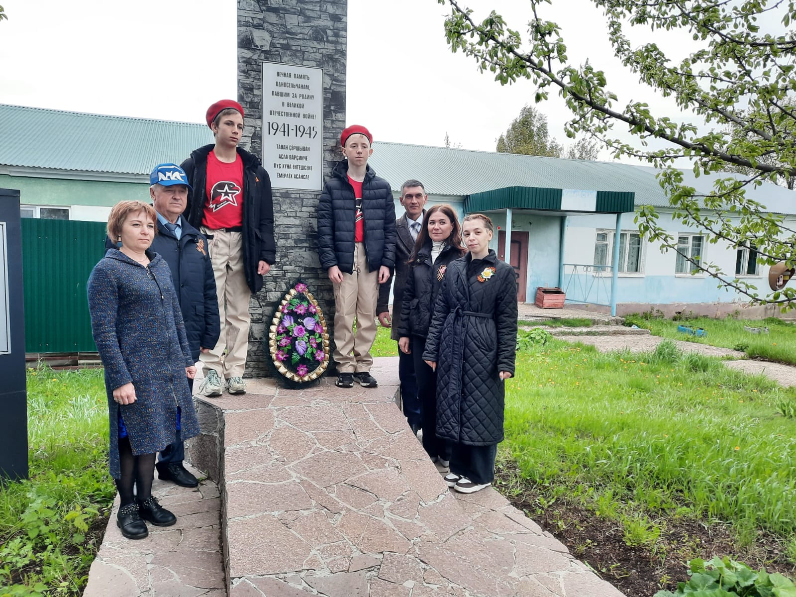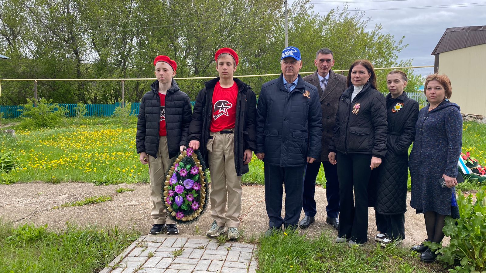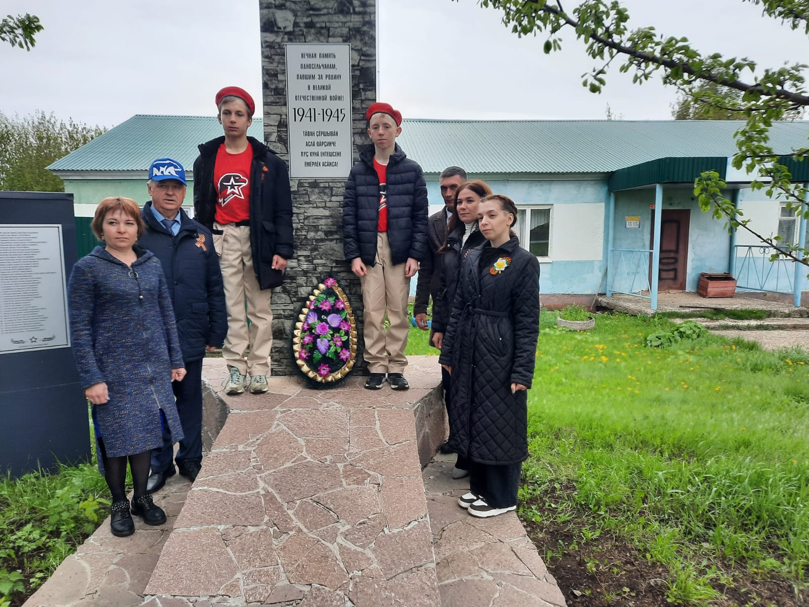 Торжественный митинг, посвященный 79-й годовщине Победы советского народа в ВОВ. Директор Поручиковской школы Р.Р.Хасаншин, Глава Поручиковского СП И.И.Хаджаева, приглашенные гости, юнармейцы и Советник по воспитанию возложили венок к памятнику в д.Канаш.