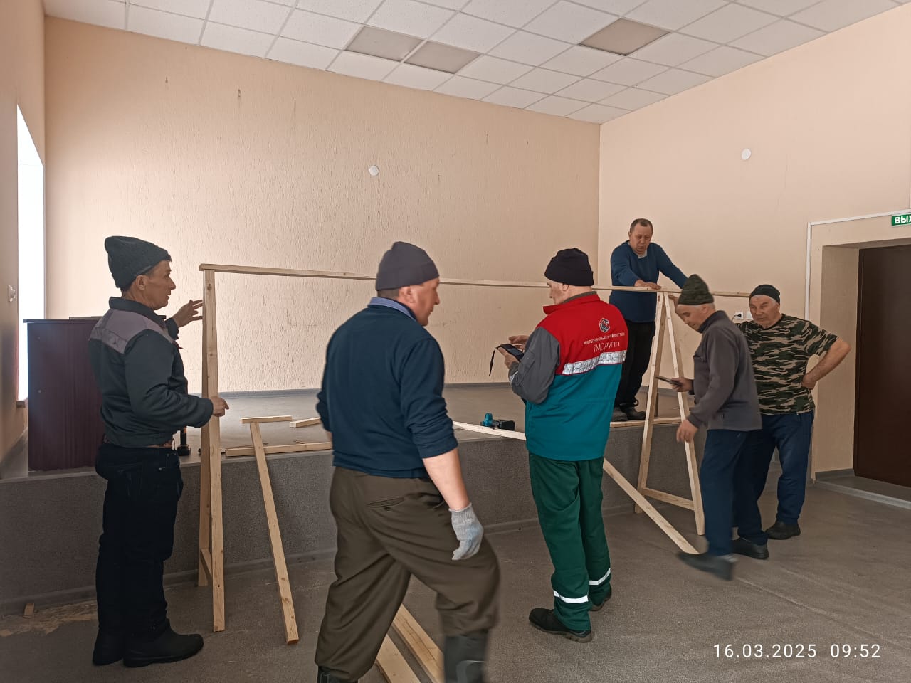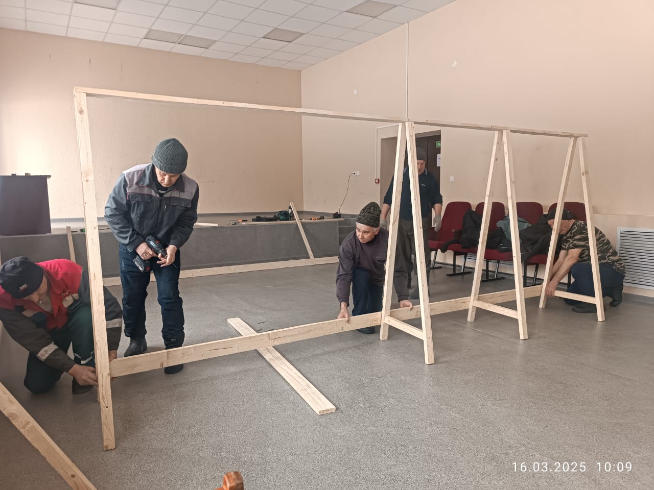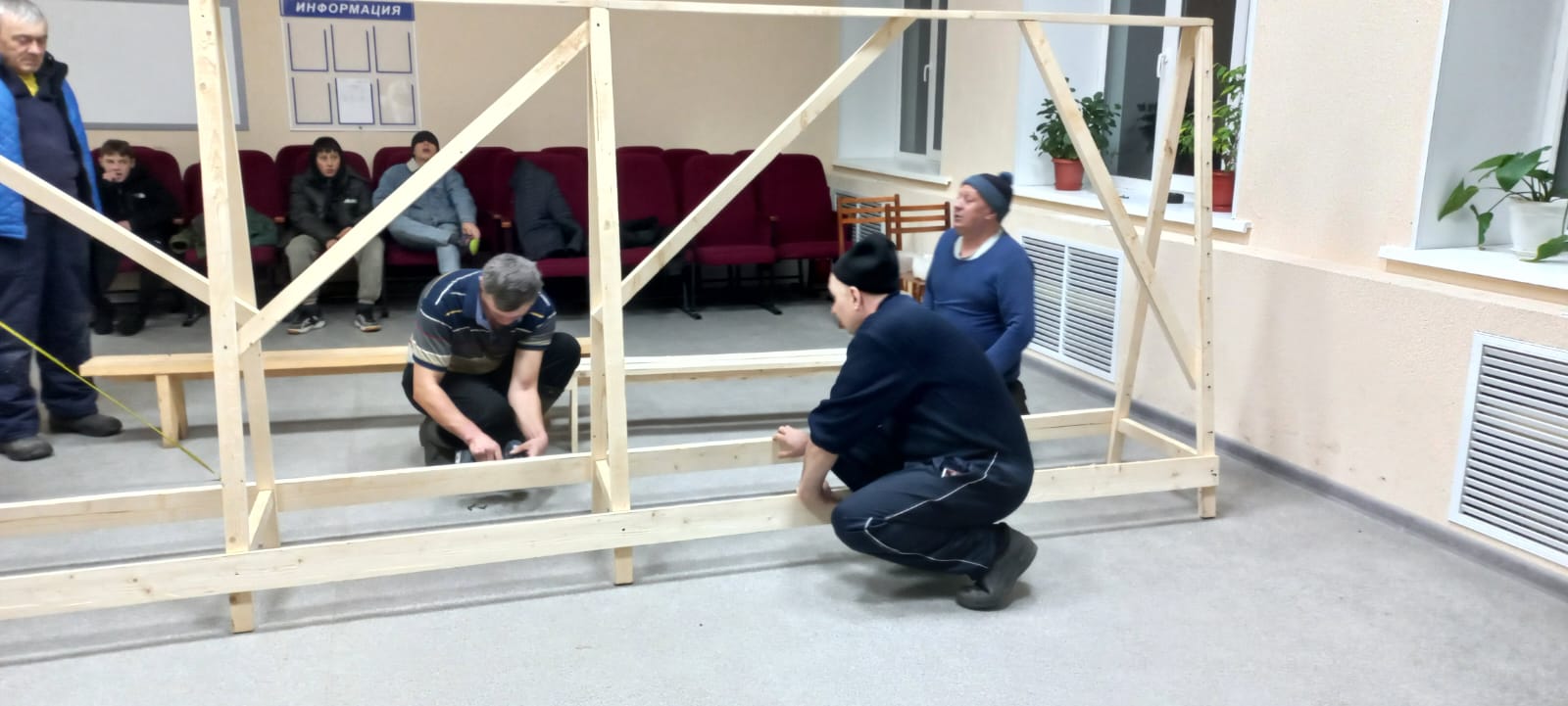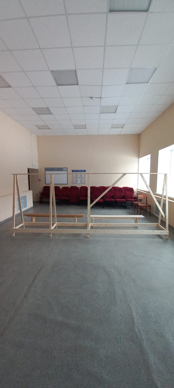 В Сарапалинском СК планируется открытие точки по плетению маскировочных сетей. В настоящее время собрали оборудование (каркас для натягивания сетей, скамейки).