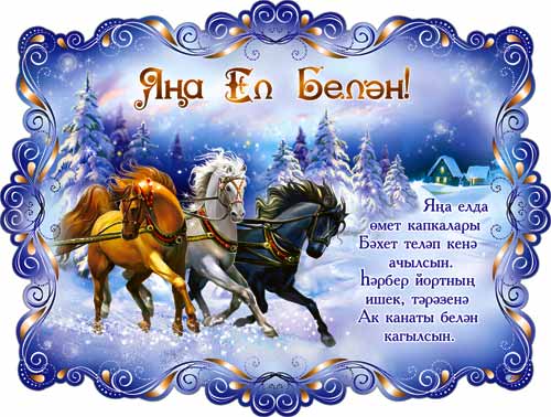 Барчагызны да якынлашып килүче Яңа ел белән котлыйм! Яңа ел сезгә кары белән бәхет-шатлык, суыгы белән күңел күтәренкелеге, яхшы кәеф, эштә уңышлар алып килсен! Яңа ел белән яңа өметләр, хыяллар өегезгә керсен! Кайгы-хәсрәт сезне урап узсын! Барлык изге теләкләрегез кабул булсын! Бәйрәм белән!