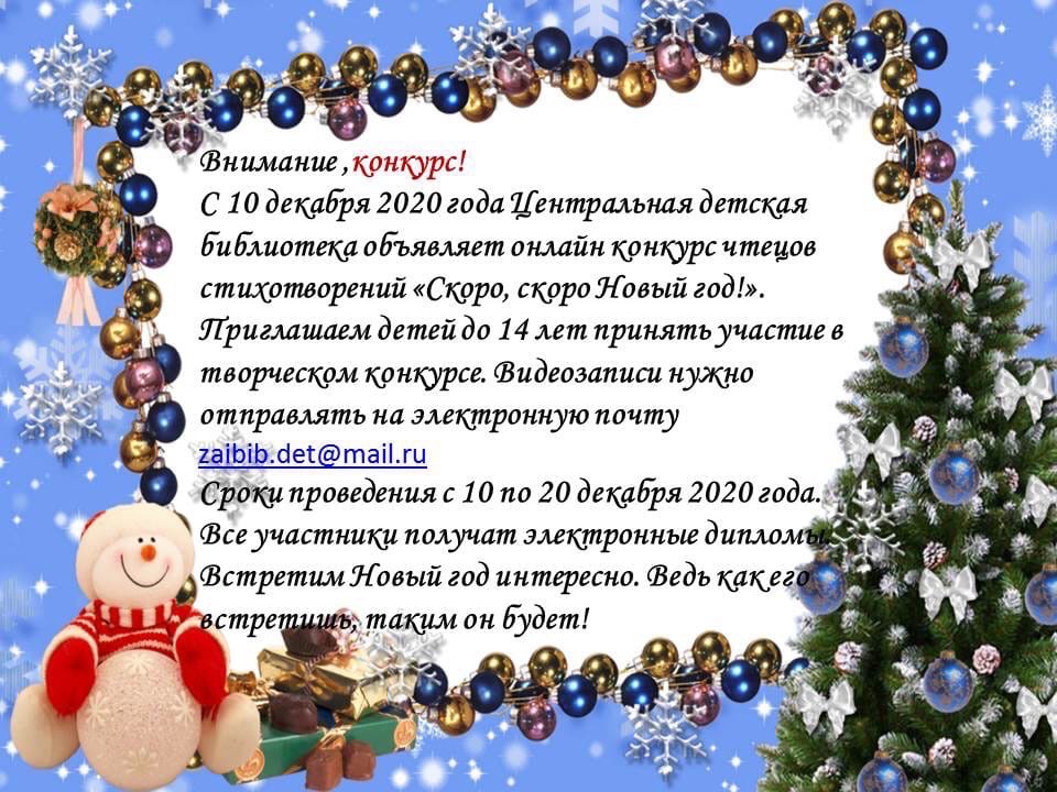 Внимание, конкурс! С 10 декабря 2020 года Центральная детская библиотека объявляет онлайн конкурс чтецов стихотворений "Скоро, скоро Новый год!"