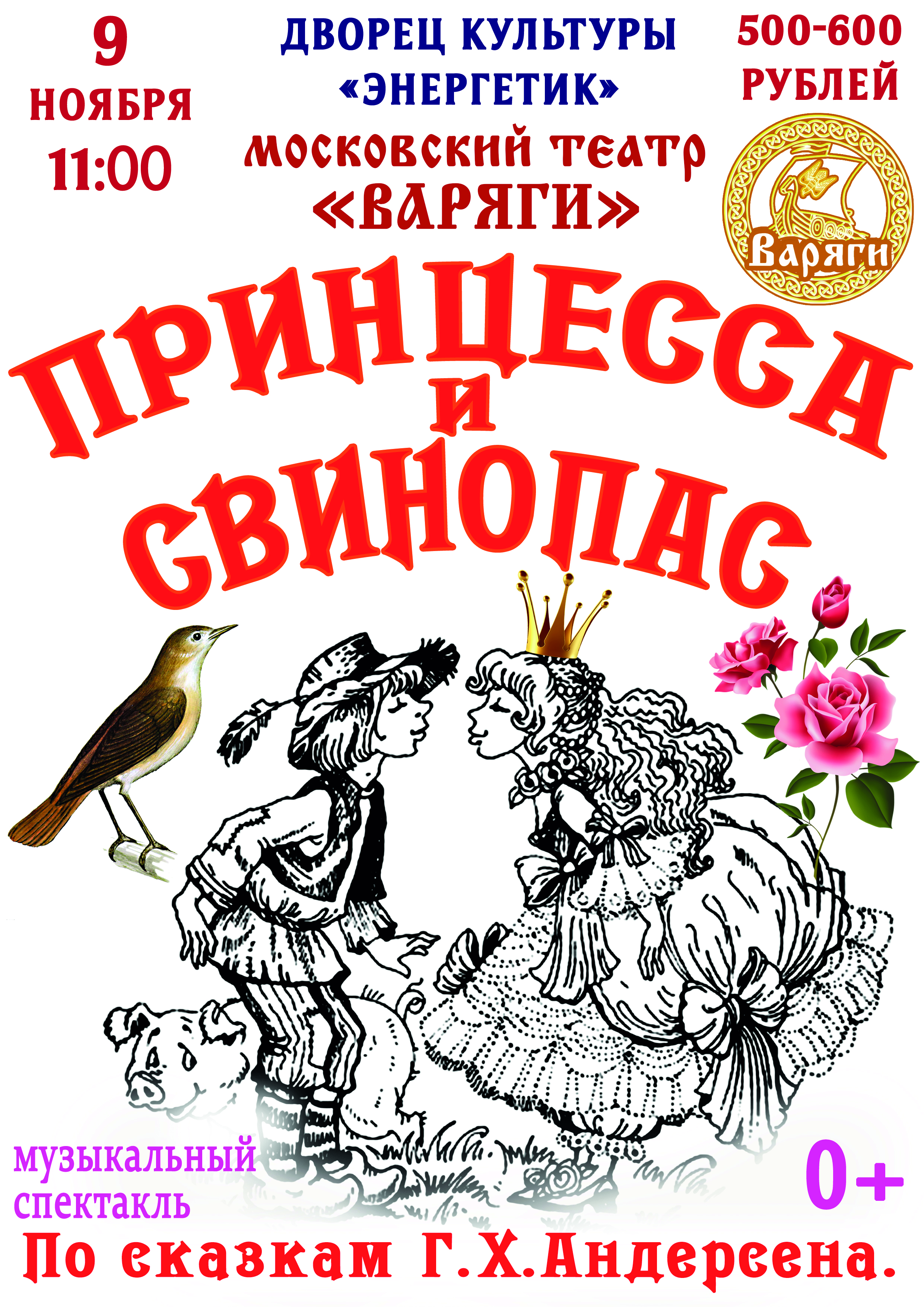 9 НОЯБРЯ 2022 ДК "ЭНЕРГЕТИК" МУЗЫКАЛЬНЫЙ СПЕКТАКЛЬ. МОСКОВСКИЙ ТЕАТР "ВАРЯГИ" ПРИНЦЕССА И СВИНОПАС . 0+. ЦЕНА БИЛЕТА 500-600 РУБЛЕЙ