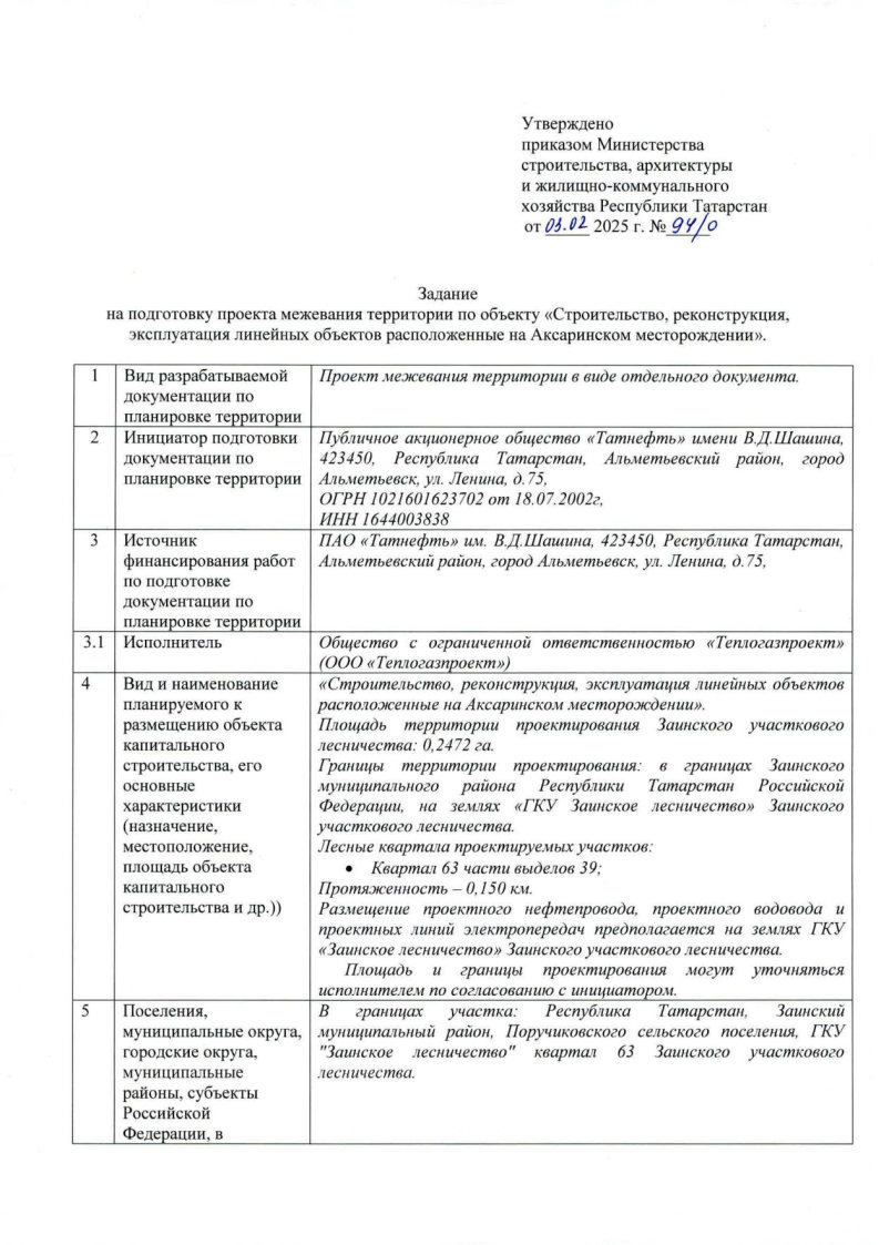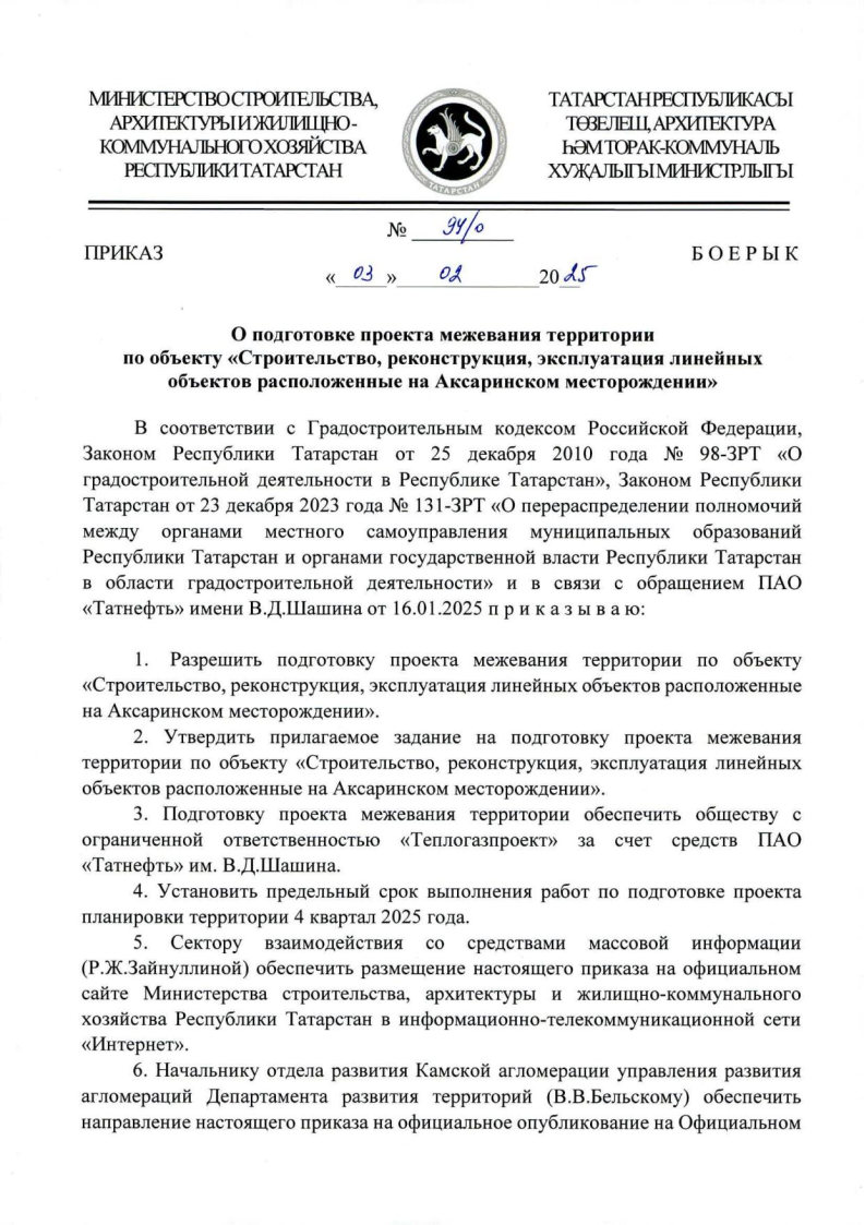 Приказ Министерства строительства, архитектуры и жилищно-коммунального хозяйства Республики Татарстан «О подготовке проекта межевания территории по объекту «Строительство, реконструкция, эксплуатация линейных объектов на Аксаринском месторождении»