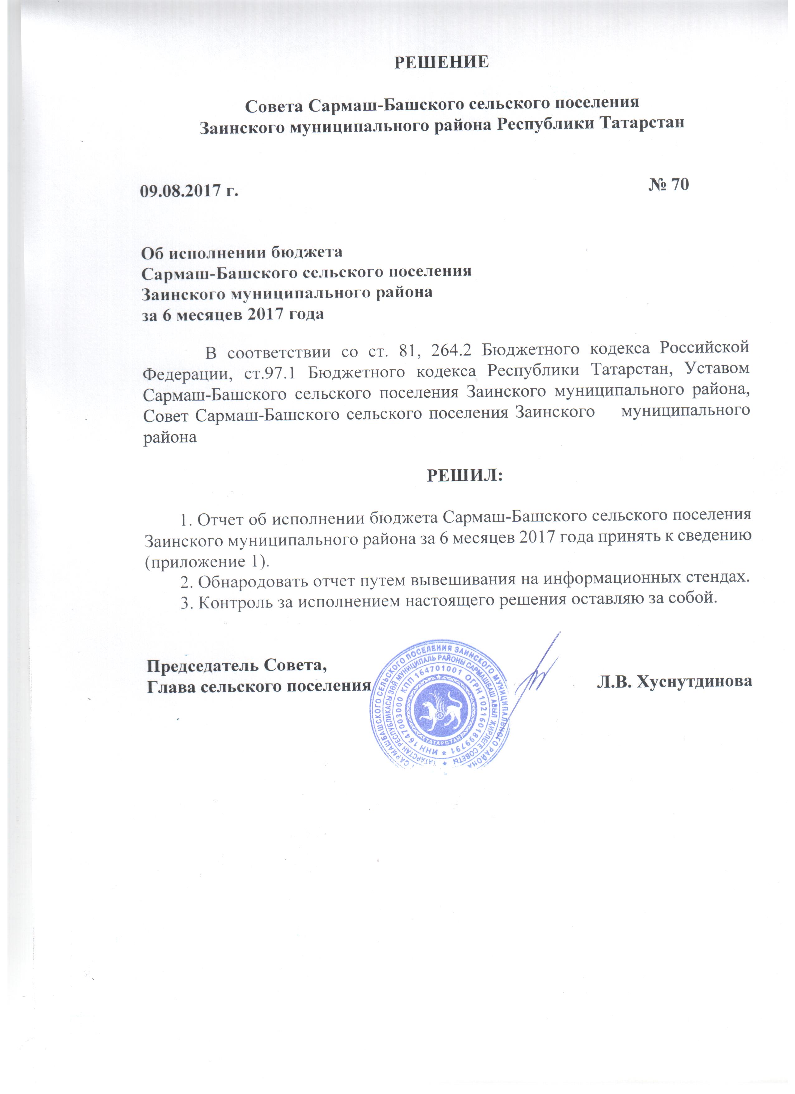 от 09.08.2017 № 70 "Об исполнении бюджета Сармаш-Башского сельского поселения Заинского муниципального района за 6 месяцев 2017 года"