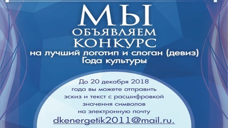 2019 ел Зәйдә «Мәдәният елы» дип игълан ителде. Мәдәният-кеше тормышының төрле өлкәләрендә бик күп әһәмияткә ия төшенчәләр: аралашу культурасы, үз-үзеңне тоту культурасы, мәдәният культурасы һ.б.ларны үз эченә ала. Конкурста яше нинди булуга карамастан, теләгән һәркем катнаша ала. 2018 елның 20 декабренә кадәр сез символларның эскиз һәм текстын dkenergetik2011@mail.ru. электрон почтасына юллый аласыз. Конкурста җиңүчене шәхси бүләк көтә. Җиңүчеләрне бүләкләү 2018 елның 27 декабрендә «Яшьлек " боз сараенда ел нәтиҗәләренә багышланган бәйрәм чарасында булачак. Барлык сораулар буенча «Энергетик» мәдәният йортына 2-85-15, 2-86-40 телефоннары аша мөрәҗәгать итәргә мөмкин.