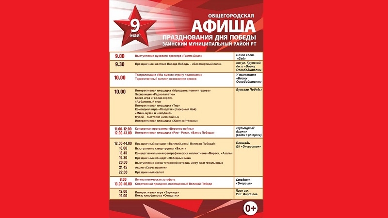 9 Май -Җиңү көненә багышланган бәйрәм чаралары программасы: 09.00 - Бөек Ватан сугышы ветераннары һәм кунаклар очрашуы. "Гамма джаз» тынлы оркестры чыгышы. 09.30 – Җиңү Парадының тантаналы йөреше, Крупской урамыннан "Азатлык сугышчысы" һәйкәле янына кадәр. 10.00-тантаналы митинг, «Без бергә илне күтәрдек» театральләштерелгән тамашасы, веноклар салу, «Азатлык сугышчысы» һәйкәле янында. 10.00 – «Яшьләр батырларны хәтерли» интерактив мәйданчыгы, Җиңү бульвары. 11.00-12.00 – концерт программасы. 12.00-14.00 " Бөек көн! Бөек Җиңү!»-концерт программасы. 18.00 «Визит» кавер - төркеме чыгышы. 18.45 «Мирас» һәм «Азаль» вокаль - хореография коллективлары концерты. 19.30 «Җиңүле май»- бәйрәм концерты. 21.45 – «Хәтер шәме» акциясе, 22.00-Бәйрәм салюты, «Энергетик» мәдәният йорты мәйданы.