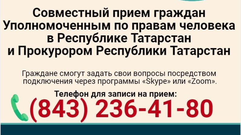 2020 елның 14 июленә Татарстан Республикасында Кеше хокуклары буенча вәкаләтле вәкил һәм Татарстан Республикасы Прокуроры тарафыннан видеоэлемтә режимында гражданнарны кабул итү планлаштырыла. Республиканың муниципаль районнарында яшәүчеләр сорауларын, «Skype» яки «Zoom» программаларына тоташып, турыдан-туры бирә алачак.