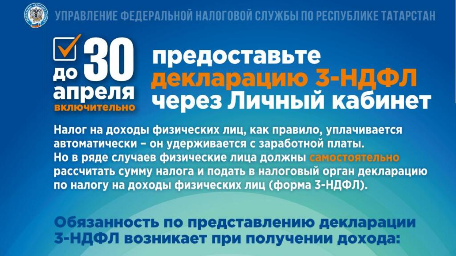Федераль салым хезмәтенең Татарстан Республикасы буенча 11 нче районара инспекциясе "30 апрельгә кадәр шәхси кабинет аша 3-НДФЛ декларациясен тапшырырга кирәк"леге турында хәбәр итә.
